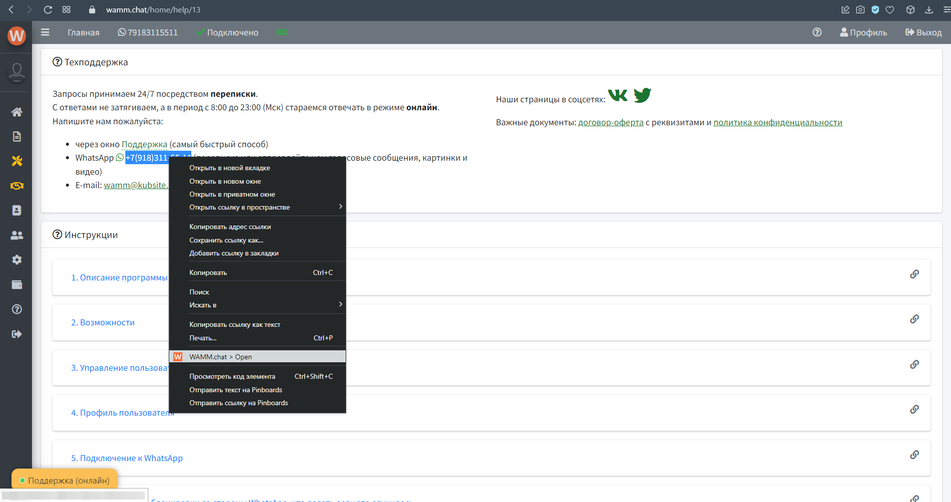 Расширение WAMM.chat для браузеров - это дополнительный инструмент, который значительно упрощает работу с контактами и чатами. Основная функция расширения - быстрое создание чатов непосредственно с любой веб-страницы. Достаточно выделить номер телефона и через контекстное меню моментально открыть чат в сервисе WAMM.chat.